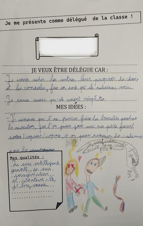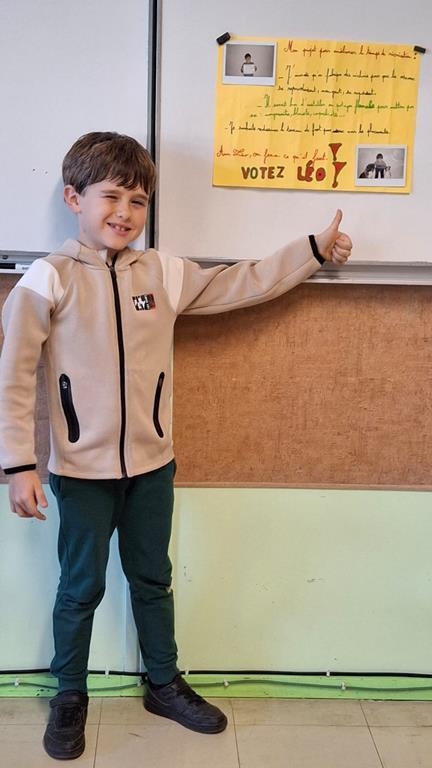 Une nouveauté pour cette année, les élèves vont participer à un conseil de délégués. Dans chaque classe, deux enfants ont été élus suite à leurs candidatures. Lors de la campagne, les candidats ont présenté leurs idées pour améliorer le quotidien de tous. Les élus représenteront l’ensemble des élèves lors des conseils avec Hélène VINCENT.