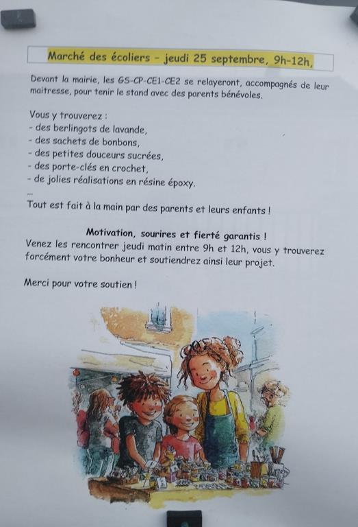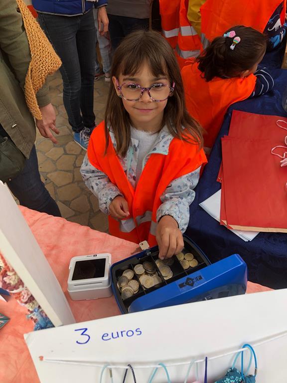 Les élèves du cycle 2 du site Saint Louis sont partis en classe découverte cette semaine. Pour en financer une partie, les enfants se sont transformés en marchands. Un jeudi matin du mois de septembre, à l’aide de parents, ils ont vendus des friandises, des gâteaux maison, des objets faits main sur la place du marché. Le 1er acheteur était même M. le maire. Merci aux parents ! Ils avaient préparé des affiches en production d’écrit, ils ont dû calculer les sommes et rendre la monnaie, oser parler aux passants… un sacré défi largement relevé ! Ils sont très fiers de cette expérience.