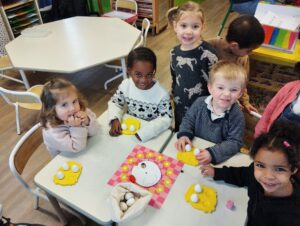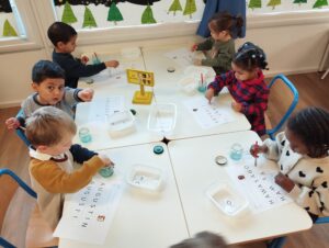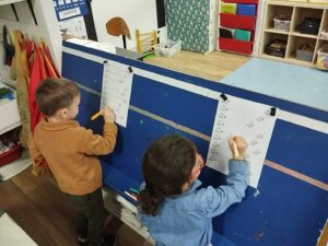 Nombres : travail sur la réalisation d’une collection (autrement dit un ‘groupe de’) 1, 2 ou 3 objets. Ici les objets figuraient les bougies de gâteaux d’anniversaires d’un ours, puis d’un renard, puis d’un éléphant.