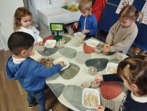Motricité fine : remplir la bouteille de pâtes en utilisant des pinces. Pas facile à manipuler, la 1ère fois.