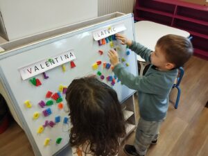 Nous avons démarré le travail sur la notion de lettre, de prénom, de 1ère lettre. Un prénom, c’est des lettres, c’est un mot, avec des lettres qui ont un ordre.