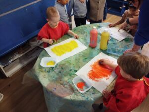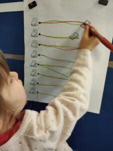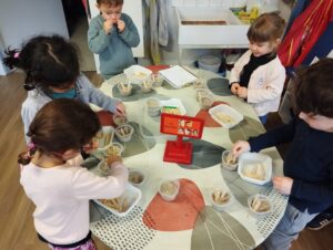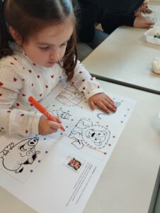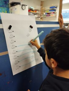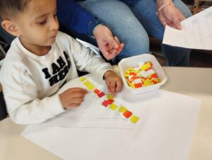 Nombres : travail sur la réalisation d’une collection (autrement dit un ‘groupe de’) 1, 2 ou 3 objets. Ici les objets figuraient les bougies de gâteaux d’anniversaires d’un ours, puis d’un renard, puis d’un éléphant.