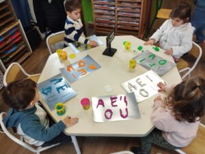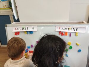Nous avons démarré le travail sur la notion de lettre, de prénom, de 1ère lettre. Un prénom, c’est des lettres, c’est un mot, avec des lettres qui ont un ordre.