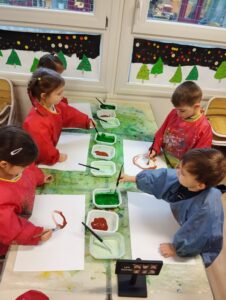 Atelier peinture en AUTONOMIE. Une seule consigne : ne pas mélanger les couleurs et essayer d’utiliser tout l’espace de la feuille. Et se laver les mains SANS PATOUILLER. Les adultes ont seulement aidé à mettre la blouse.
