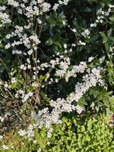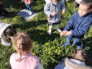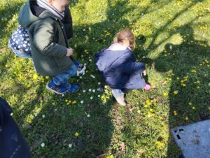 Nous avons vu que sont apparues des fleurs, dans l’herbe mais aussi sur certains arbres. A la fin de la promenade, les enfants ont dû cueillir 3 fleurs différentes.