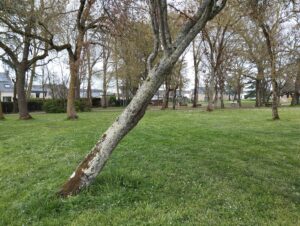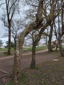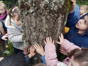 La 2ème fois, nous avons davantage regardé la forme des arbres : il y en a des très gros et des tout petits, il y en a des très hauts, d’autres qui sont droits, d’autres qui penchent…et en particulier nous avons touché les troncs : découverte de la notion de RUGUEUX, par opposition à lisse/doux.