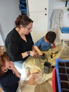L’APEL nous aégalement mis à contribution pour semer les graines dans les godets destinés à la vente aux familles de fin avril.