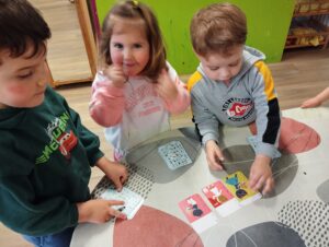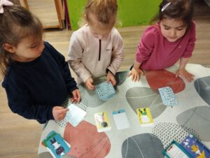 Le jeu de cartes ‘Batamiaou’ qui se joue comme le jeu de la bataille. Chaque carte est un chat d’une taille allant de 1 à 6. On compare donc les grandeurs. Et c’est aussi pour certains la découverte des jeux de carte, l’envers/l’endroit de la carte, le sens de la carte, le placement de la carte, manipuler une carte, un paquet de cartes etc… Tout un apprentissage.